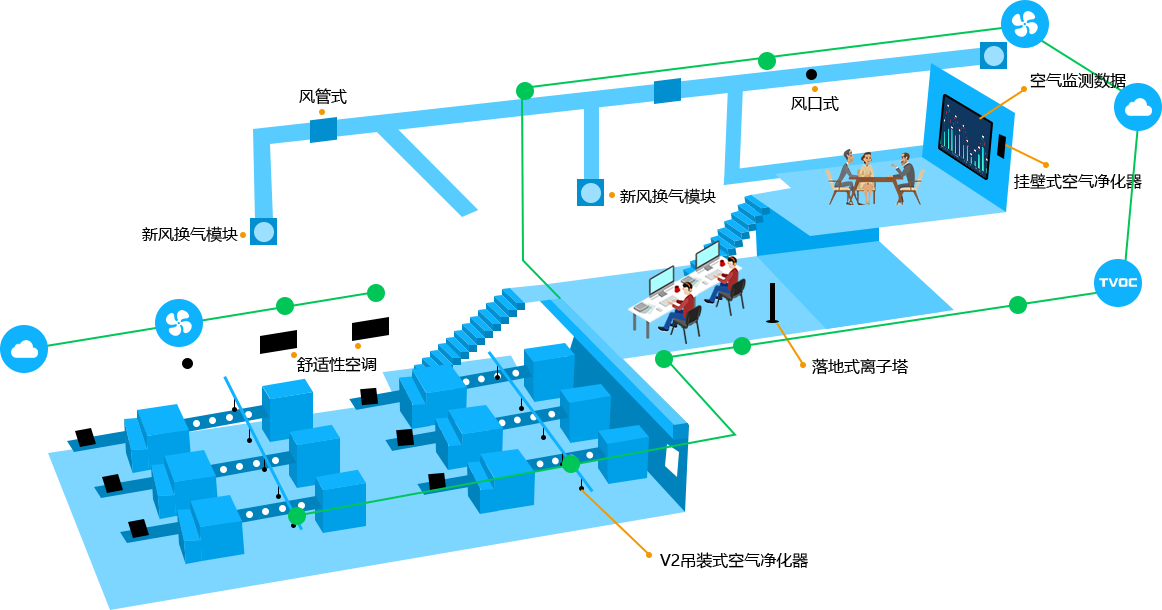 健康建筑环境系统:本着“让环保蒂固现在,让生态构建未来”的宗旨,打造以“创建清新人居”为核心,设计、施工、运维三位一体的服务 平台,为用户提供一站式全方位的专业综合解决方案,享受更加智能的人居环境。